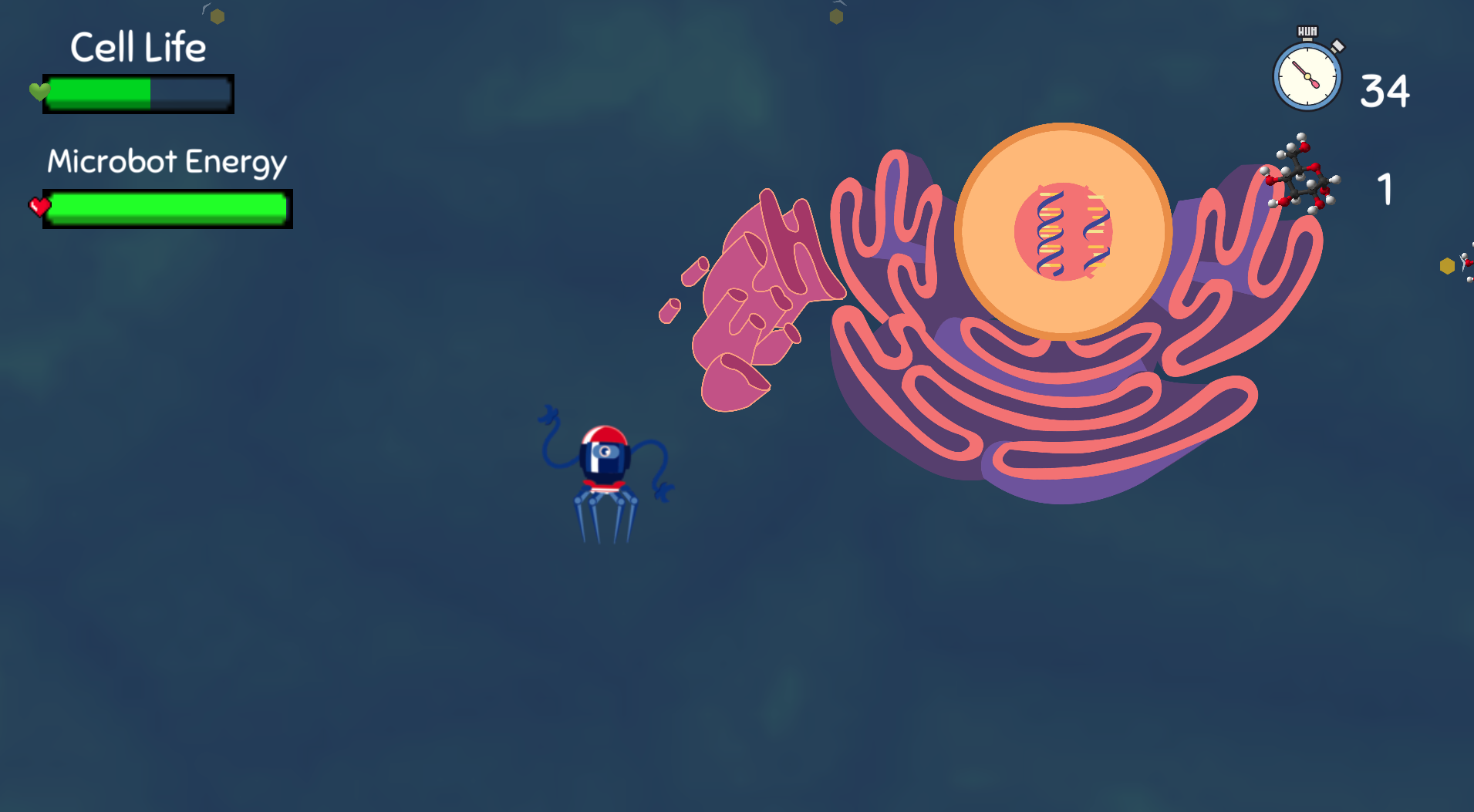 Learn about different cell organelles and visualize them. You are a microbot fixing injuries of cell organelles inside the cell.